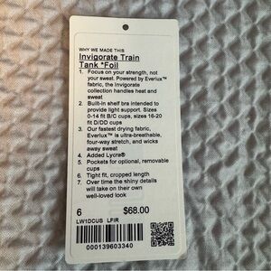 Invigorate Train Tank Top with Everlux fabric. Features built-in shelf bra and added Lycra. Tight fit, cropped length. Comes with matching Lululemon leggings.