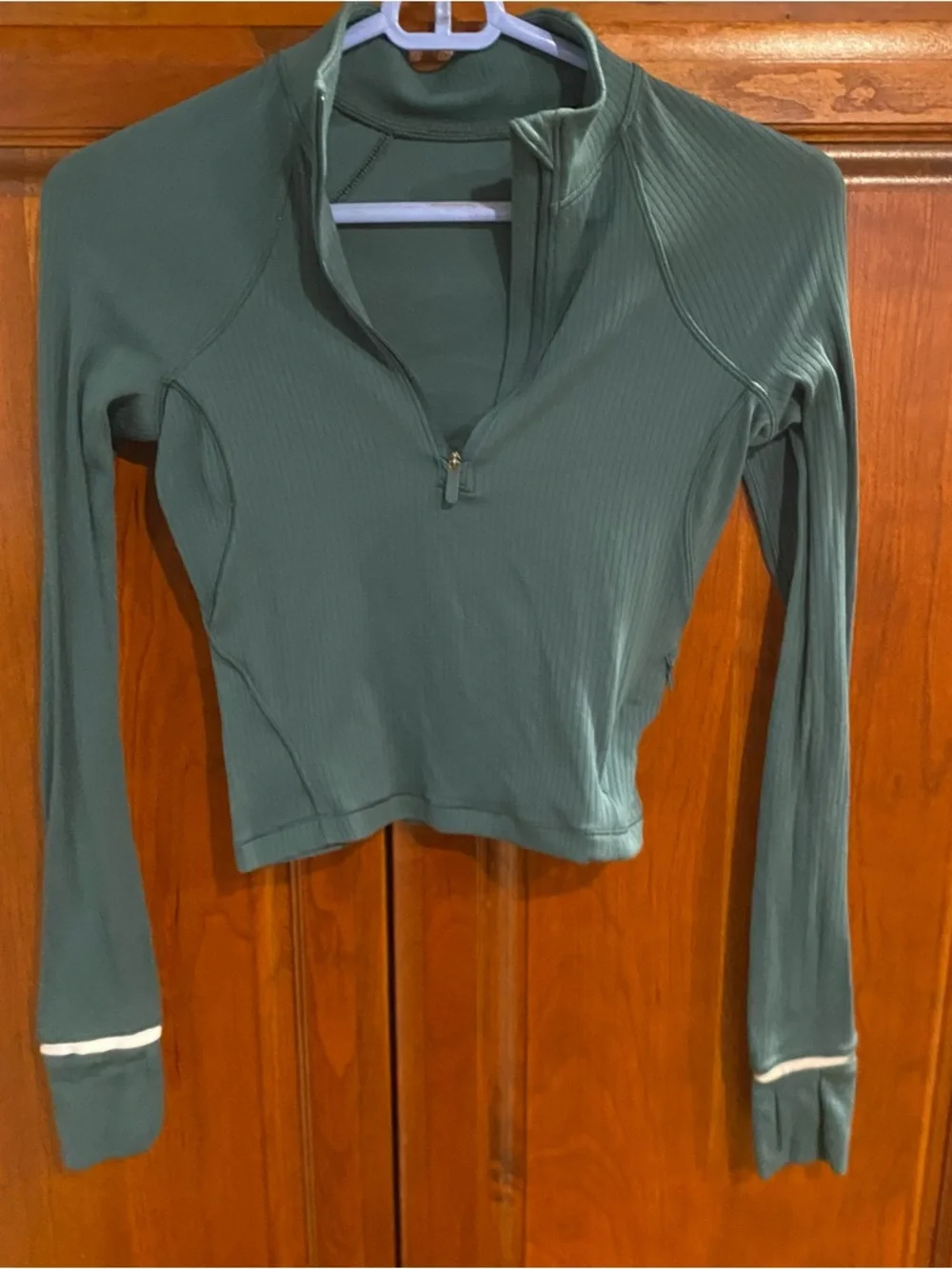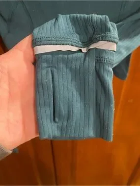 Ribbed long-sleeve quarter-zip pullover. Slim fit with subtle seam shaping. Lightweight, stretchy knit for comfort. Thumbhole cuffs with reflective trim. Easy to layer for workouts or casual wear. In great condition size 0