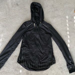In great condition, black with silver hardware and detailing. Zip-up with hoodie (which can also be tucked away into jacket), and nicely fitted.