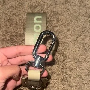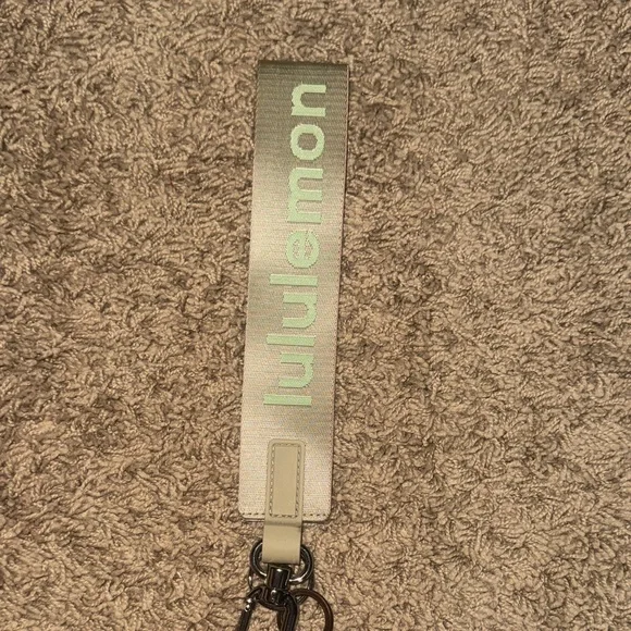 Stylish Lululemon keychain wristlet. Features a beige and green design.