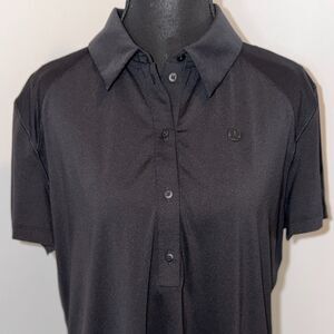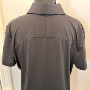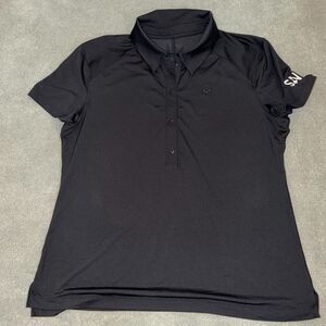 Lululemon women's polo shirt in a sweat wicking material. Solid black with Lululemon logo on the chest.