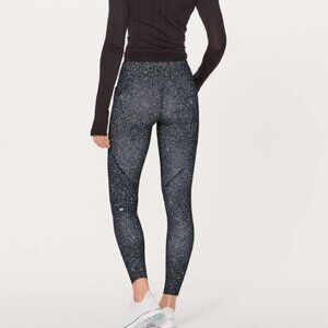 The Lululemon Lead The Pack Tight is a women's leggings in size 4, featuring a black and white spotted pattern with an ankle-length style. Made from Luxtreme material, it has a mid-rise waist of 24 inches and an inseam of 27 inches. Perfect for active wear, this stylish piece is from the Lululemon brand. 9" rise. Excellent condition, no flaws.