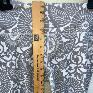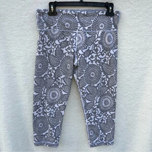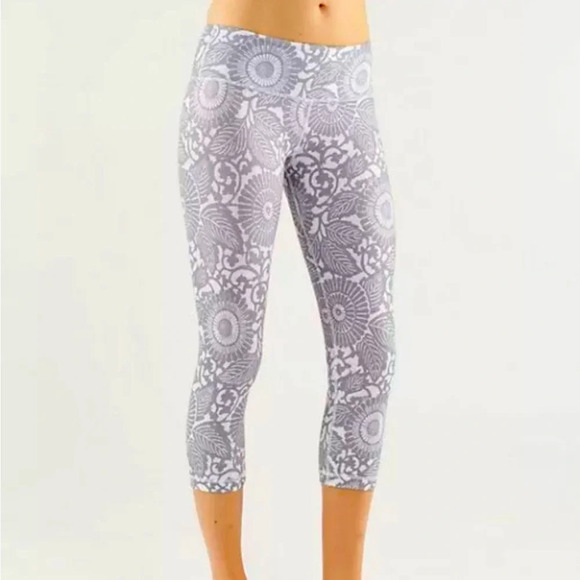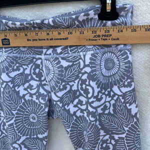 This product is a pair of women's Lululemon leggings in size 8/10, featuring a floral and paisley pattern in a beachy, gray color called Fossil Gray. The size tag is missing, but the waist measures 30 inches. Lululemon states that their Size 8 is 29 in and Size 10 is 31 in. Therefore, it is about an 8/10 size. EUC!