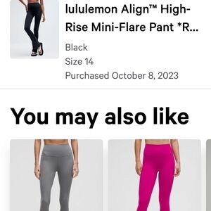 GUARANTEE THESE LEGGINGS are in excellent condition. They were worn three times. All of the information about these pants are found in the photos. You can also see a Lululemon video on line. Just search for align high-rise mini flare. I am selling both these exact pants in Java as well. ABSOLUTELY NO PILLING ON THESE PANTS.