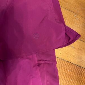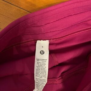 Lululemon leggings in a rich magenta / fuscia Attached skirt. Pockets in either side of pants for stowing phone. Like new condition. These are full length.