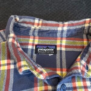 The product is a men's XL organic cotton flannel plaid shirt by Patagonia, featuring a blue, yellow, and red color scheme. This button-up shirt has long sleeves and is made from comfortable cotton flannel fabric. With its stylish plaid pattern and high-quality material, this shirt is suitable for casual wear and offers a comfortable and warm option for cooler weather.