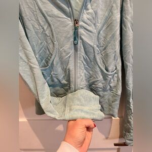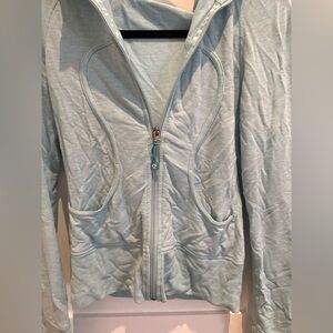 Stylish light blue zip-up hoodie with front pockets and a hood. Perfect for casual wear.