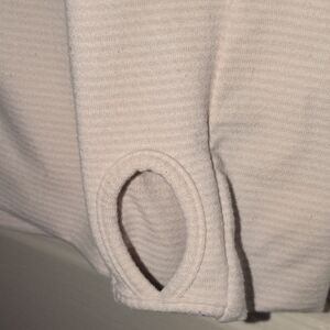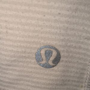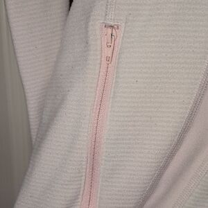 Stylish light pink/white zip-up from bottom or top of jacket with front zippered pockets and thumb holes. Perfect for casual wear. Lululemon pattern in front and Logo in back. In good condition with a minor wash wear. Could not find the size. I'm description.