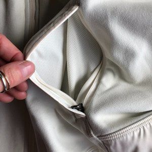 Lululemon lightweight running vest with stowable hood. Cream color with barely noticeable polka-dots. Pockets zip closed. Vest is soft and stretchy. Upper material blocks wind light rain. Soooo flattering! Clean all around.
