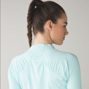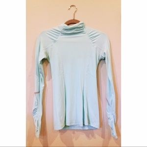 Thin buttery fabric feels like a second skin... but softer! This fabric is ultra stretchy. It's ruched detailing is featured on the neckline, back and sleeves. The color is a bit of a truer mint color than what the pictures depict.