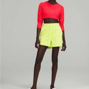 Brighten up your lounge look with these vibrant Electric Lemon Lululemon shorts. Crafted from soft, cotton-blend fleece with four-way stretch, they’re designed for cozy comfort with a bold punch of color. Whether you’re relaxing or running errands, these high-rise shorts offer a flattering fit and breathable warmth.