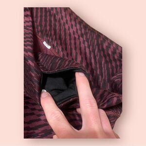 EUC. No size/material tag. I remember it to be a 6, see measurements for more detail. Purple/black graphic print. Inner key pocket. Measurements are approximate: waist 15”, rise 8”, inseam 21”.
