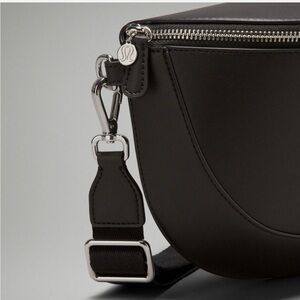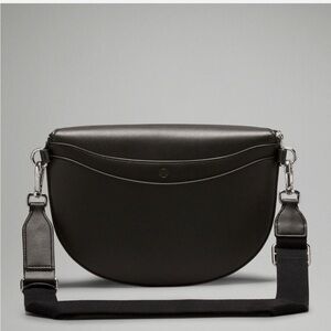 Sleek black crossbody bag by Lululemon. Features a zip closure and adjustable strap.