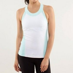 Fun workout top with stylish and functional cut outs on the back. This top looks great on all bodies given the two tone colors of white and aquamarine. It's in good used condition and has more life to live!