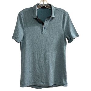 Keywords: Lululemon, men's polo, blue polo, short sleeve, collared shirt, casual wear, activewear, heathered pattern, lightweight, breathable, button-down collar, machine washable, Vietnam, pre-owned, excellent condition.