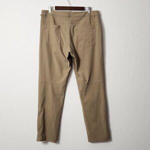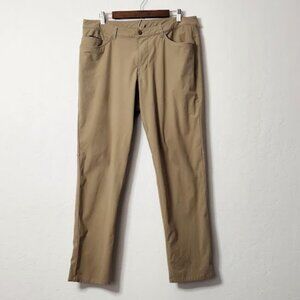 The Lululemon Men's Chino Style Pants in size 36 are versatile and comfortable pants perfect for casual or travel occasions. Made from a blend of polyester, cotton, and elastane, these khaki-colored pants feature a solid pattern, zip and button closure, and a flat front design. With a mid-rise fit and straight leg style, these pants offer a regular fit and are machine washable for easy care. The chino style adds a touch of sophistication, while the comfort and stretch material ensures a comfortable wear all year round.