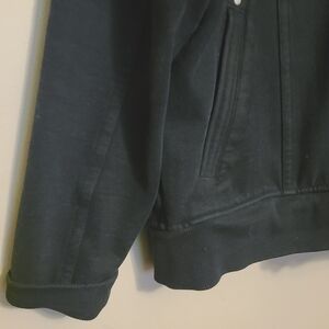 Men's classic black, full zipper, scuba hoodie by Lululemon, size XL. Hoodie has some weight to it, with front chest snap button pockets, side zippers and front slant pockets. Fabric blend of cotton, polyester and lycra. Hoodie has drawstring ties at collar with red grommets. Excellent pre-owned condition overall; slightly faded but no holes or rips. Can be worn as a light jacket; unisex.