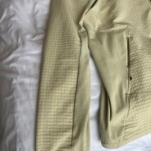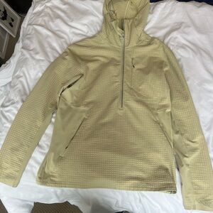 This is a Dew Green (yellow/green) pullover from lululemon purchased in 2022. This jacket is very useful for exercising in the cold due the thumb holes and hood. There is minimal wear to the thumb holes on the sleeve. Ask for more pictures if interested!