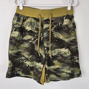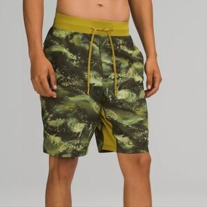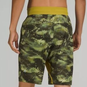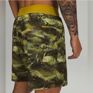 Lululemon men’s shorts | Auric Gold camo shorts | T.H.E. linerless shorts | 7” training shorts | size medium lululemon | gym shorts with zip pocket | sweat-wicking workout shorts | jacquard athletic shorts | quick-dry lululemon men | high dive camo print shorts
