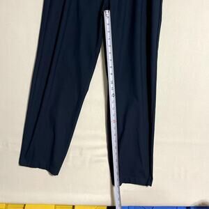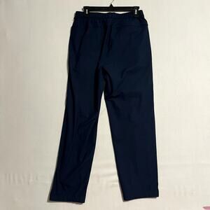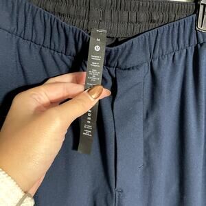 These are men's Lululemon pants, size Medium, in a versatile True Navy blue color. They feature an elastic waistband with an interior drawstring for a comfortable, adjustable fit and a classic trouser style that can be dressed up or down. They appear to be one of Lululemon's popular technical pants,made with a high-performance fabric like Warpstreme. The fabric is designed for everyday performance, offering four-way stretch, shape retention, wrinkle resistance, and breathability, and contains recycled polyester. They have front pockets and a subtle side logo detail. The pants feature a relaxed or classic fit through the hip and thigh, tapering slightly to the ankle.