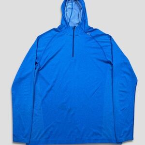 Stay comfortable and stylish with this blue hooded half zip long sleeve shirt. Perfect for casual outings and active wear.