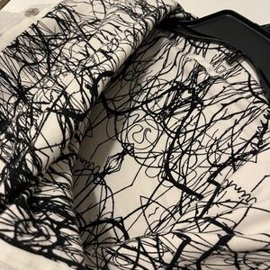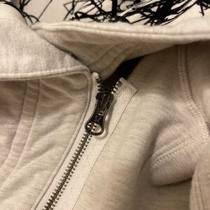 Very good preowned condition- minor wear. Thick sweatshirt style material, very soft and cozy! Black and white bird’s nest print on lining. Color is a soft Heather oatmeal light cream tan color with a hint of grey. Silver zipper and snaps. Thumb holes and ribbed cuffs. Longer in back.