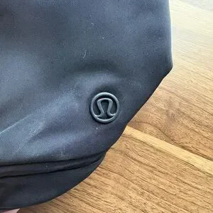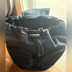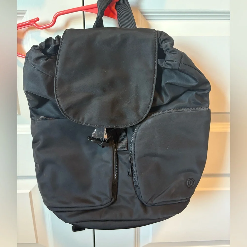 Lululemon mini backpack (10L) with pockets on the outside, drawstring + flap with buckle closure, and pockets on the inside for water bottle and “items of importance”. Black, great condition