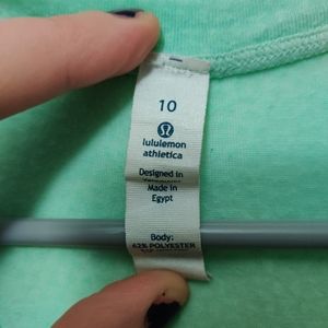 Size 10 Lululemon Mint green Racerback Tank. Light and flowy. See through in the right light, but very comfortable. Slight pilling in the armpit area. See photos for measurements. I am usually a size large and this fit perfect! Always washed cold with fragrance free detergent and line dried.