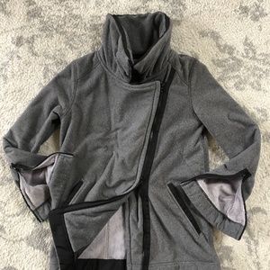 We designed this long, loose fitting jacket to keep us cozy on our way to and from the studio. Made of soft Fleece fabric, it has an asymmetrical zipper and wide collar to help lock in heat. Unzip the wrist zippers for extra airflow after a sweaty practice plenty of pockets for your phone and cards cut long and loose to keep your warm.