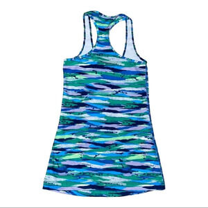 Features: gray, blue and green spays of color throughout, racerback, stretch material