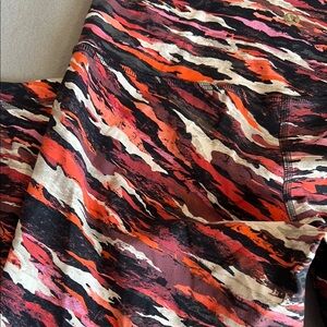 Vibrant Lululemon leggings with a striking multicolor pattern. Features shades of red, pink, black, and white.