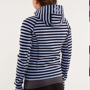 New without tags. Lululemon Scuba Hoodie--Stretch in "Sea Stripe Printed Polar Haze Black." This was a Special Edition that I purchased in NYC. It has "OM" and "Namaste" on the back in Black. Without stretching the material at all, armpit to armpit is about 18.5" but has a little give. From the seam at the bottom of the hood straight down the back is about 23." Size 8.