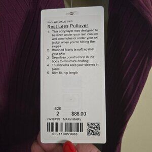 New with tags Lululemon Rest Less Long Sleeve Pullover in Marvel Plum. Features thumb holes and a slim fit. Note: Has discoloration on the front as pictured. Retail price was $88.