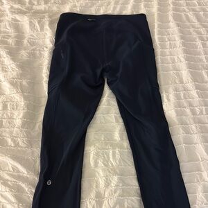 Wunder Trains. Stylish navy blue leggings. Perfect for casual wear. Have pockets on side of legs and a zipper pocket in the back — perfect for keys / money / cards