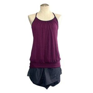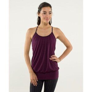 Lululemon yoga tank top with integral sports bra in deep plum color. Features include: mesh panels in high-sweat zones to help stay cool and dry, breathable Circle Mesh fabric is moisture-wicking, removable cups add shape and give coverage at the bust the wide band around the hips keeps the tank in place