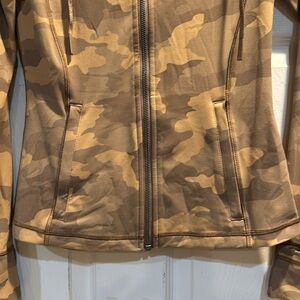 Gently worn Lululemon Align Hooded Jacket women’s size 6. Super soft moisture wicking Nulu performance material, tan heritage camo color, hooded, full zipper up front, long sleeves with flip down cuffs- thumb holes in cuffs, rear lulu logo, fitted. Offers accepted!