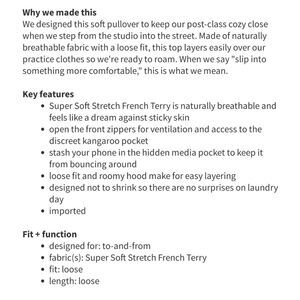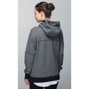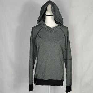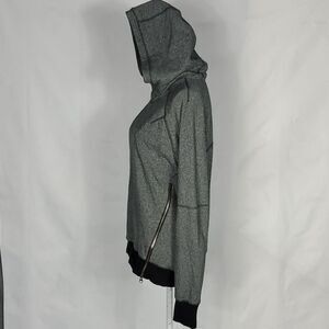 Heathered speckled black/ black stretch French terry. Heathered black hooded pullover with ribbed solid black hem and cuffs, side zippers and thumb holes. Excellent condition. Pullover measures approximately 20" across bust and 24" from shoulder to bottom.
