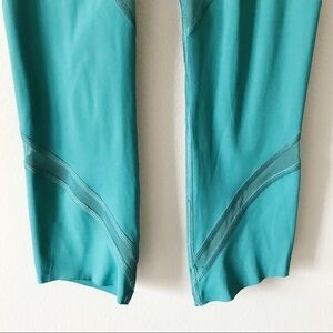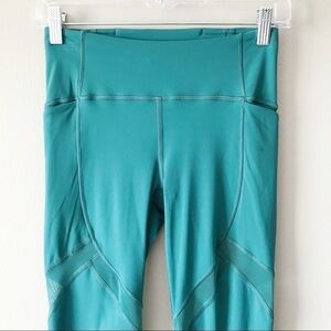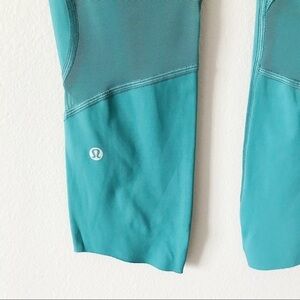 Lululemon On Pace Crop leggings with 21” inseam. Color is Deep Cove (a turquoise green/blue). Nulux fabric. Quick drying. Moisture wicking. Lightweight. Stretch. Drop-in pockets on sides. Waistband pocket at back. Retailed for $118. Pre-owned, excellent used condition- very minimal wash wear.