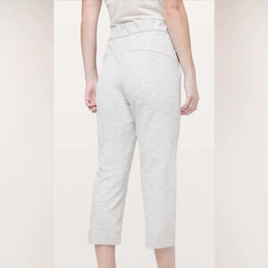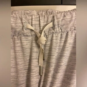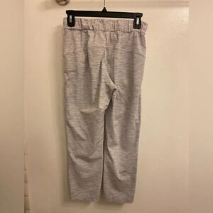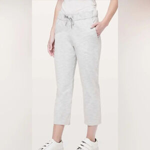 Lululemon On The Fly Crop Wee Are From Space Gray and White Size 2. Good pre-owned condition. There are a few marks on the inner waistband, not noticeable when worn. The waistband has a little wear but still works just fine. Inseam 25in.