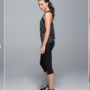 Lululemon Clip in Tank Top. Sleeveless. High neck. Open back that you can tie up or leave as is. Gray striped with breathable perforations on the front and back for ventilation. Sweat wicking. Lightweight Luon fabric.