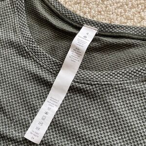 Excellent used condition Lululemon Open Up Tie Back Tee in Camo Green. The fabric is super soft honeycomb mesh with an open back detail that can be tied or left open. Very cute item.