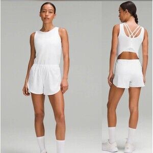 The Lululemon Open-Back White Running Romper in size 6 is a stylish and comfortable one-piece outfit perfect for casual occasions. Made of a blended fabric with a nylon material, this sleeveless romper features a solid white color with the brand's logo accents. The romper includes a pair of shorts with a 3-inch inseam, making it ideal for summer and spring seasons. Easy to care for with machine washable properties, this romper embodies the athleisure theme for a trendy and functional look for active women on the go.