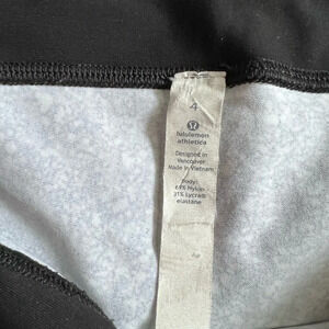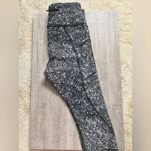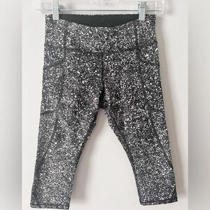 Excellent condition size 4 Outrun Crop in luxtreme water wicking material. 17” inside leg seam for a cropped style. Full length is 23”. Black and white splatter pattern.