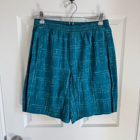 Lululemon men's Pace Breaker Lined Shorts 9", size medium. Teal with white grid pattern. Built in liner. No trades.