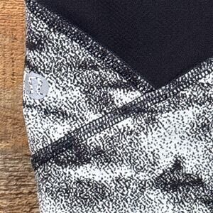 Lululemon Pace Rival Crop 22" Leggings. Style# W6AGCS. Size 4. Color ~ Power Luxtreme Hazy Days Black White / Black. Side pockets. Black mesh cutout on the calves. Zipper pocket on the back. Excellent condition. Measurements are in the pictures.