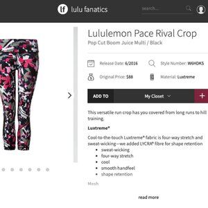 Pace rival crop from Lululemon in Pop Cut Boom Juice Multi / Black. Waistband pocket. Style code W6HDKS.