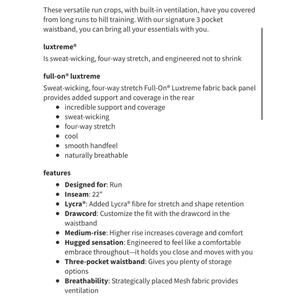 These Lululemon Pace Rival run crops are in excellent condition and engineered to not shrink. They feature a 3-pocket waistband, sweat wicking 4-way stretch Full-on Luxtreme, Lycra, waist cinching continuous drawcord, medium rise for incredible support and coverage and are breathable.