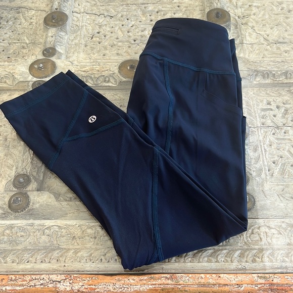 Dark TEAL (not navy) pace rival crop pants! Super flattering stitching and mesh detail on the calf. Two side pockets and one zip pocket in the back. Worn only a few times cause they are too small.