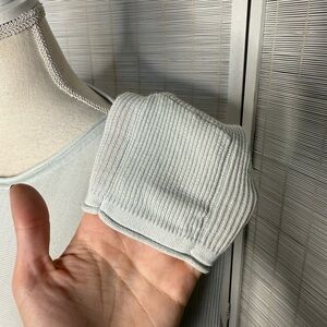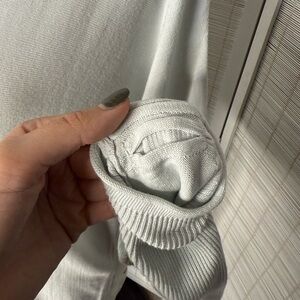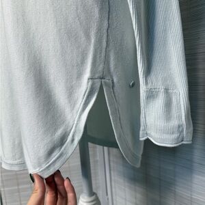 ✨ Lululemon thin lightweight pale blue/mint colored knit long sleeve. Hidden thumb slits. Tight fitting arms, loose fitting on the torso. Missing the tear away tag. Light wear to the fabric from being washed. Good used condition.