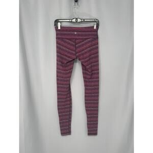 The Lululemon Pant Size 6 Wunder Under III Space Dye Twist Regal Plum Athleisure is a stylish pair of leggings perfect for activewear. Made from a blended fabric, these compression leggings feature a pull-on closure and a low-rise fit. The regal plum color with a striped pattern adds a touch of athletic charm, while the 30-inch inseam and skinny leg style provide a flattering fit. Ideal for winter, summer, fall, or spring, these leggings are machine washable and suitable for activities like gym workouts, yoga, or running. The Lululemon brand ensures quality and performance in every wear.